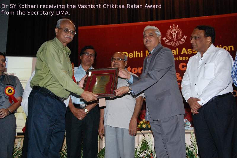 Dr. SY Kothari, New Delhi. Vashisht Chikitsa Ratan Award, Awarded by the Delhi Medical Association.