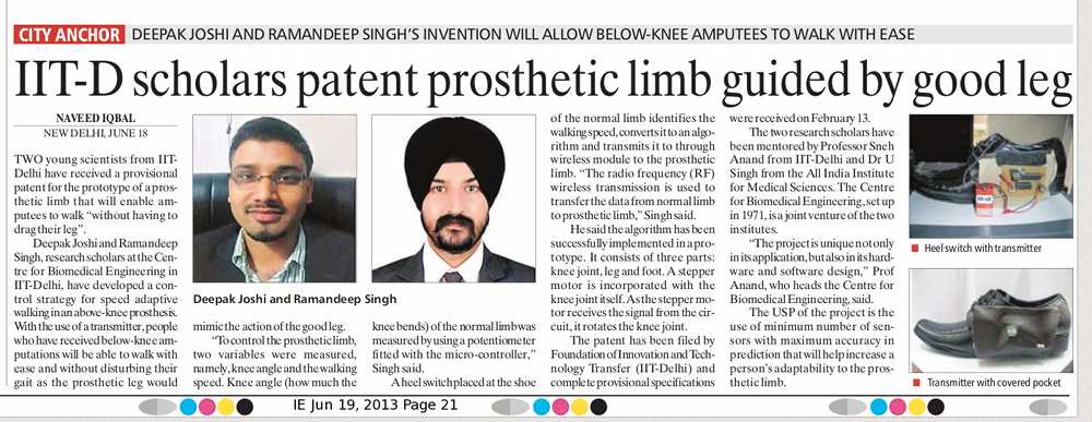 Dr. U Singh, New Delhi. AIIMS, Delhi and IIT Delhi patented "Contral-lateral Limb Controlled Prosthetic Knee Joint".